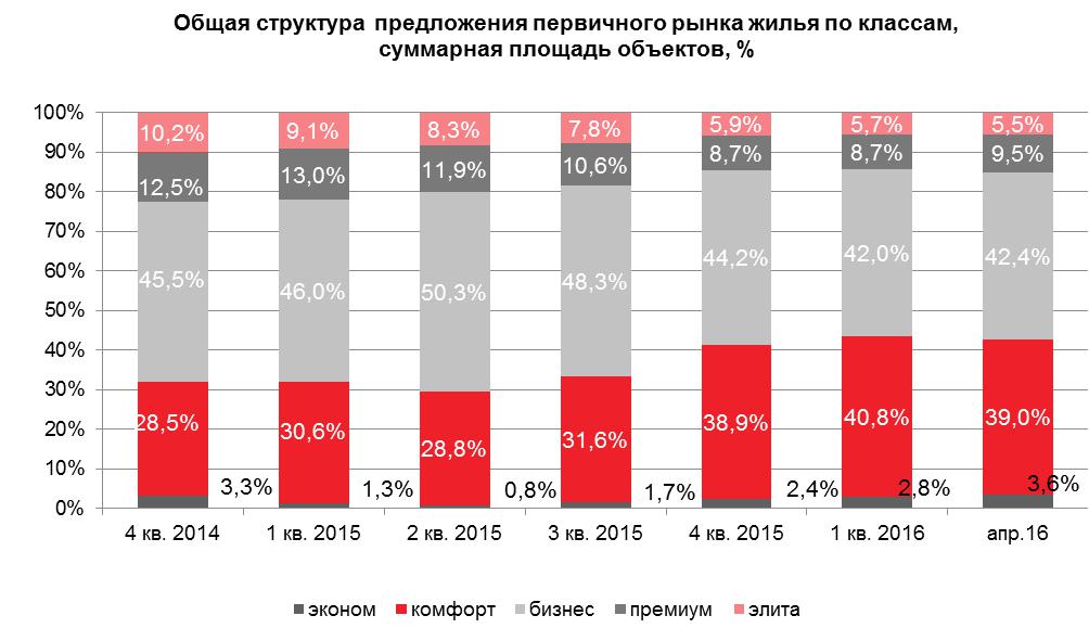 Большая половина сданных домов принадлежит к сегменту «бизнес», в то время как новостройки комфорт-класса заняли 41.4% всего объема предложения. Однако самым значительным увеличением объема предложения могли похвастаться здания, принадлежащие к эконом- (32%), премиум- (11.2%) и бизнес-классу (3%).