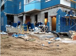 На придомовой территории в настоящее время выполняются работы по благоустройству – укладка асфальта, монтирование малых архитектурных форм. Также производится монтаж плитки при входах в здание.