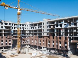 Третий корпус жилого комплекса полностью построен под кровлю – на стройплощадке завершены работы по устройству монолита, кладке внешних стен, монтированию лестничных маршей и вентблоков.