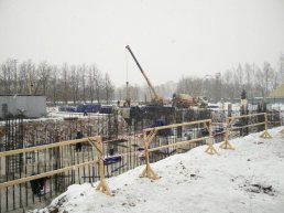 На данный момент выполнено бетонирование и армирование колонн цоколя первой секции, работы осуществляются на следующих двух секциях. Также на стройплощадке производится монтаж башенного крана, при помощи которого будет производиться строительство наземной части дома.