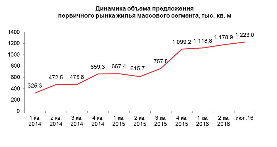 В прошлом месяце объем предложения увеличился посредством выхода новых домов класса «комфорт» (например, ЖК «Атмосфера). Средняя цена возросла на 2.4%, если сравнивать с июнем. Данное явление связывается с повышением покупательского интереса к недвижимости и с повышением степени готовности жилья. В годовой динамике прослеживается уменьшение средней цены на 0.6%.