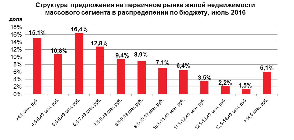Жилье стоимостью до 6.5 млн рублей пользовалось наибольшим спросом у клиентов. В общем жилплощади за 4.5-8.5 млн рублей представлены долей предложения равной 49.3%.