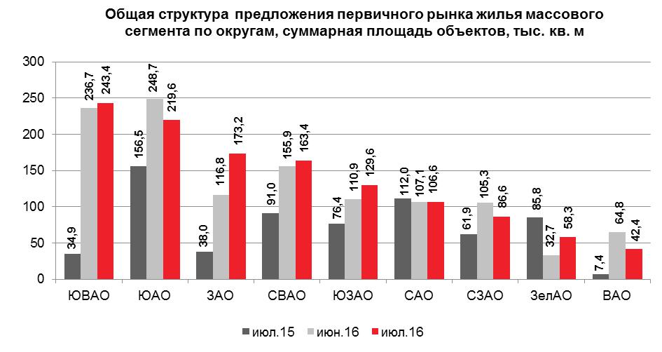 В ЮВАО сосредоточена основная часть предложений класса «эконом» (93.4%) в связи с поступлением в реализацию новых объектов. Общая доля предложения столицы приходится на ЮВАО — 19.9%. Последнюю позицию в рейтинге занимает ВАО с 3.5% предложения.