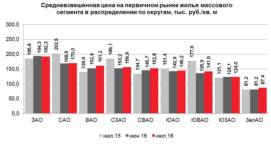 ЗелАО отличился приростом объема предложения на 78.1% за счет «Жемчужины Зеленограда» и «ЖК «Зеленый бор». Самая значительная цена за «квадрат» зафиксирована в ЗАО — 192.3 тыс. рублей.