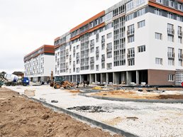В корпусе номер 11 производится отделка помещений, а в корпусе номер 12 строители проверяют канализационную систему. Параллельно осуществляется монтаж фасада.