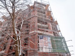 Третий корпус жилого комплекса полностью построен под кровлю – на стройплощадке завершены работы по устройству монолита, кладке внешних стен, монтированию лестничных маршей и вентблоков.