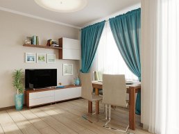 В комнатах будет установлен раздвижной диван, материал и цвет обивки которого покупатели смогут выбрать самостоятельно. Также здесь будут размещены ТВ-тумба, 2-секционный шкаф, полка для книг и навесной модуль. В прихожих разместится вместительный шкаф с вешалками, полками и ящиками.