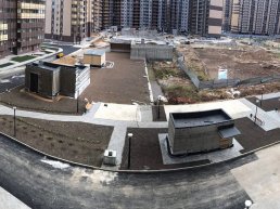 Так, были выполнены работы по устройству элементов освещения, установке МАФ, асфальтированию подъездных дорог и обустройству тротуаров. Завершается благоустройство стилобатной части подземной парковки. Производится озеленение территории.