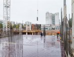 На стройплощадке ЖК «Мейн Хаус» завершилось устройство цокольного этажа, на текущий момент начались работы по укреплению стен первого этажа на двух секциях комплекса.